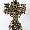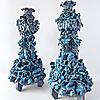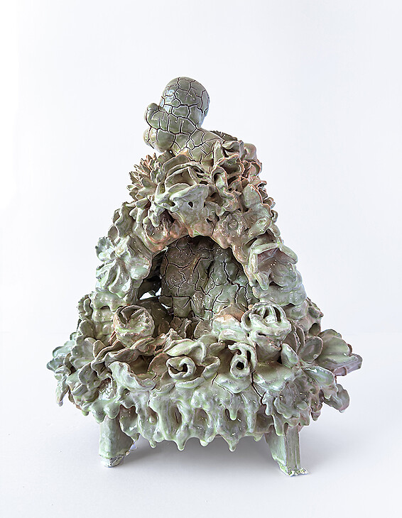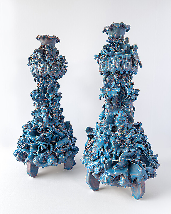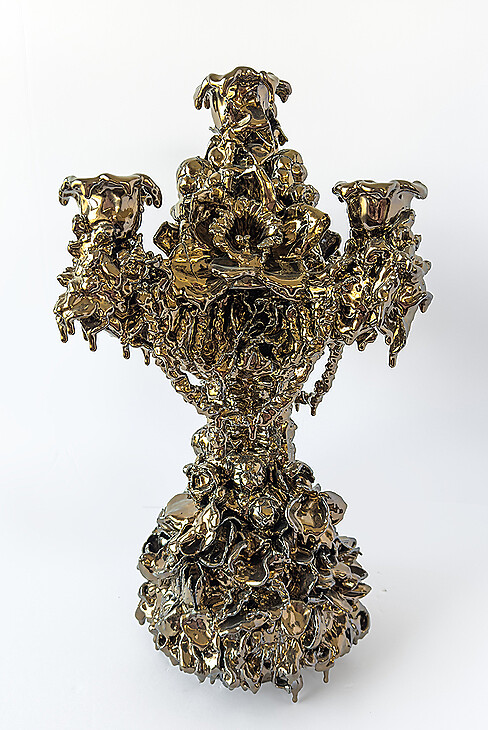 Anthony Sonnenberg’s luscious ceramic sculptures set a stage calling the spectator to ekstasis (to be or to stand outside one’s self.) The elaborate hand-built ceramic sculptures echo the decadent elaborations of Baroque and Rococo fioriture. Initially reminiscent of past civilizations’ aesthetic efflorescence, upon closer inspection, the viewer can vaguely identify familiar modern tchotchkes built into the structure.