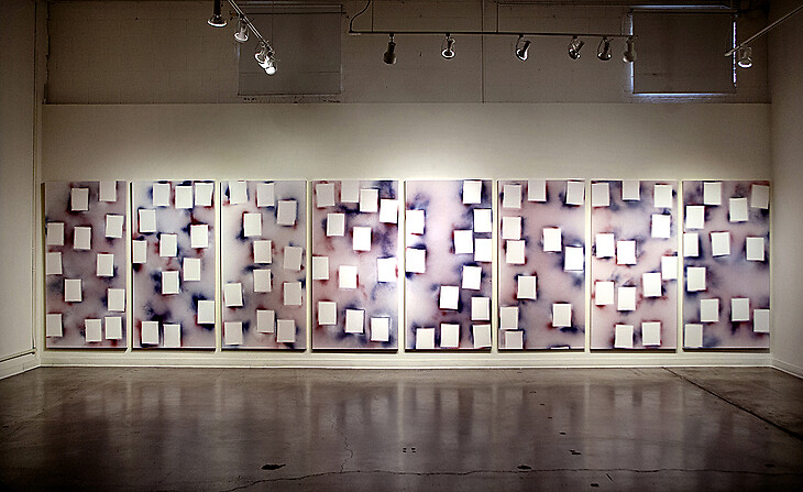 In 2018, the Dallas Museum of Art acquired a suite of eight five by four-foot paintings from Schwarz’s 2016 Desktop exhibition.