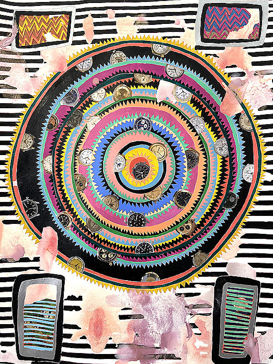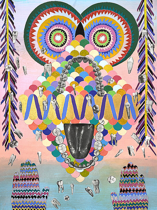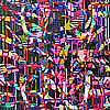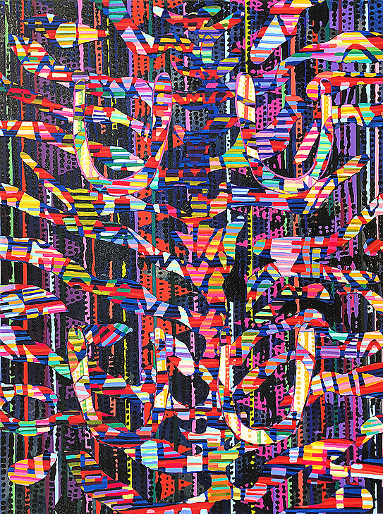 Austin-based Erin Curtis plays in patterns. As she says of her cut-canvas works, "The paintings are intensely handmade and united in their dense weavings of color that work to suffocate a space that is continually built up, broken down, stopped and reversed." These pieces almost defy perception and classification; her paintings use the material indicative of the medium, but are layered almost as collage. These compositions mimic the order of traditional tapestries, thick with texture and form, though Curtis is more playful and chaotic than any textile can offer. These paintings are a demonstration of work, incredibly intensive in the labor they require. Though they might seem maximal upon a quick glance, they are a struggle to bargain with harmony, to find colors and pattern that will please the eye.
