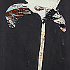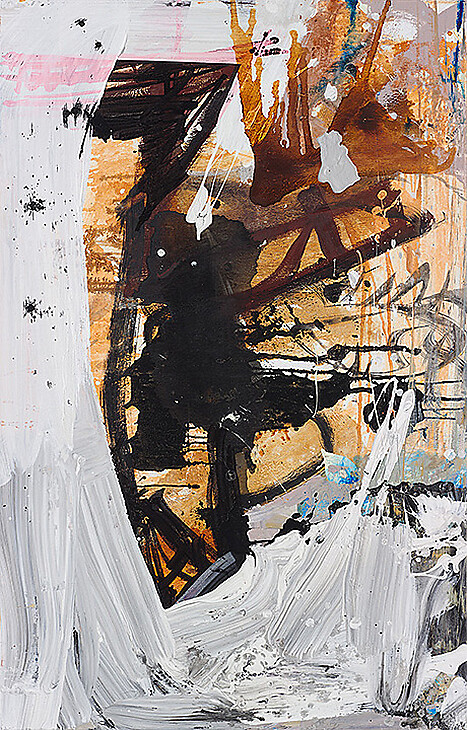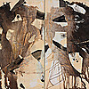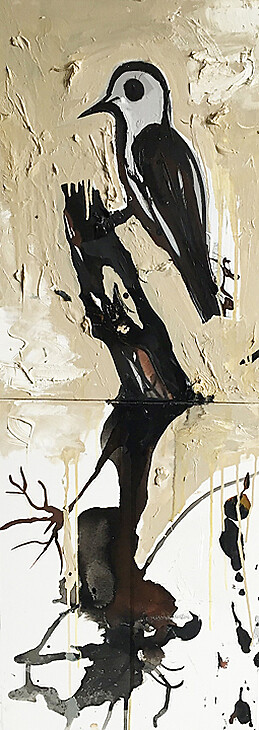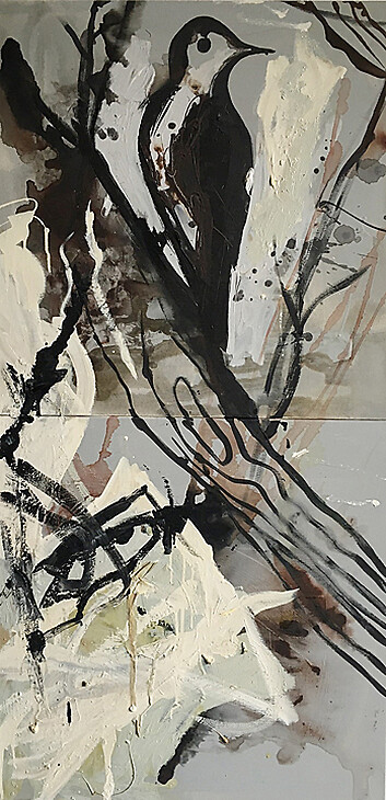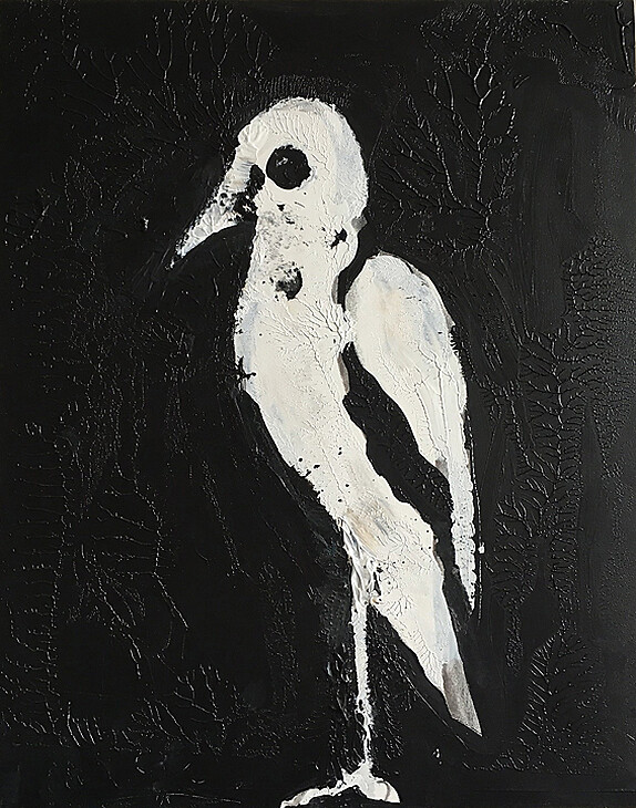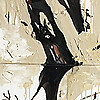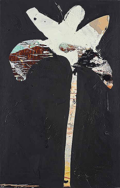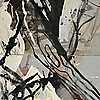 For the paintings of Tsibi Geva the artist’s hand is strongly present. Where Geva paints a bird or a flower, though distinct, abstraction is never far. The large and small scale canvases are replete with large swaths of gestural brushstrokes and multi-layered surfaces. Within those layered surfaces, Geva’s muted pallet of earth tones contrast with deep blacks and sharp whites, and are, as stated by the artist, reminiscent of the quality of light inIsrael. In the expanse of the painted surface, layers of pours, drips and splatters act as words or conversations communicating the tension between light and dark, figuration and abstraction, revelation and concealment. Geva’s paintings exist in the deep and mysterious relationship between landscape, culture and political atmosphere. In a series of small canvases, darkly outlined birds perch on dry branches against a thick creamy ground and act as witness. On another canvas, a single tall stemmed flower emerges from the negative space of black ground, revealing the gestures, opening space for another conversation. Geva writes, “I believe the political tension resonates with the formalistic one—and this tension should remain unresolved. Different levels of interpretation—the subjective/psychological, the political, and the aesthetic—coexist. I believe these three registers supplement and dialectically reflect one another.”