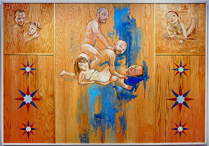 Heyd Fontenot occupies a world of cultivated friendships and cooperation. His delicate and fey drawings and paintings render the likenesses of friends and acquaintances in the tight-nit Austin art world which he inhabits. Yet while his nude subjects frolic happily across his wood panels and stark white paper, there is a sense of the diabolic in the work. Not only does the exhibition title Get Your Wood On imply the wood panels that Fontenot paints on but it also addresses the uneasy titillations which our culture associates with the nude.