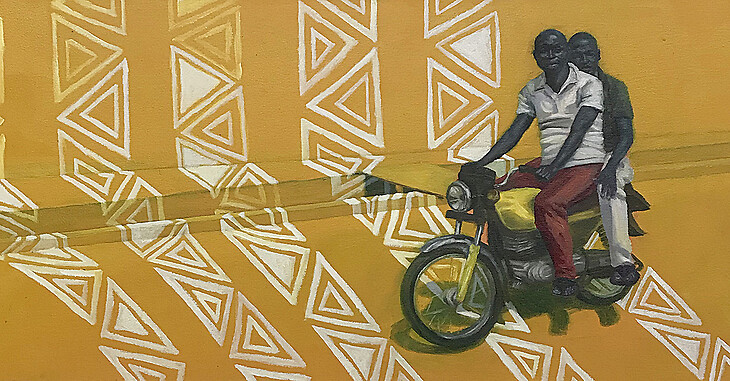 For his first solo exhibition at Conduit Gallery, Dallas based artist Spencer Evans will present a body of paintings and drawings directly drawn from the experience of travel to Lagos, Nigeria in 2017. The exhibition’s title, I Am Because We Are, is derived from a well-known philosophical African Ubuntu proverb that embodies the universal bond of sharing that connects all humanity. Evan’s original approach to the research was to explore the differences between Black American and Nigerian/African identity and a perception-rooted rift between Africans and Black Americans. Thinking about his ancestral lineage which Evans has traced to Nigeria and Cameroon, the artist worked with the Nigerian Baptist Theological Seminary and Bowen University to engage interviews. The discussions focused on identity and social constructs looking for differences between them and the millions of African descendants living in the United States. Instead, what Evans encountered was a shift of his own point of view as he discovered many similarities between the Nigerians he met and the Black Americans he knew at home.