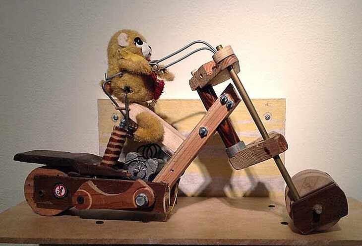 Self-taught and living in Austin, Texas, Mr. Stewart has worked and hobbied within various aspects of the construction and hardware business. The skills Mr. Stewart has acquired in these fields has earned him the expertise with which he manipulates the raw materials he uses for the works. In some instances, this part of the process requires several months to gather the exact perfect elements to complete a piece. The pieces themselves are fully functional, kinetic and are meant for hands-on enjoyment.