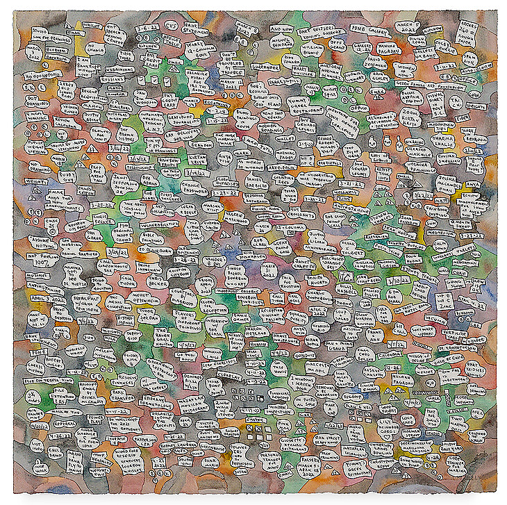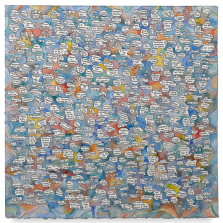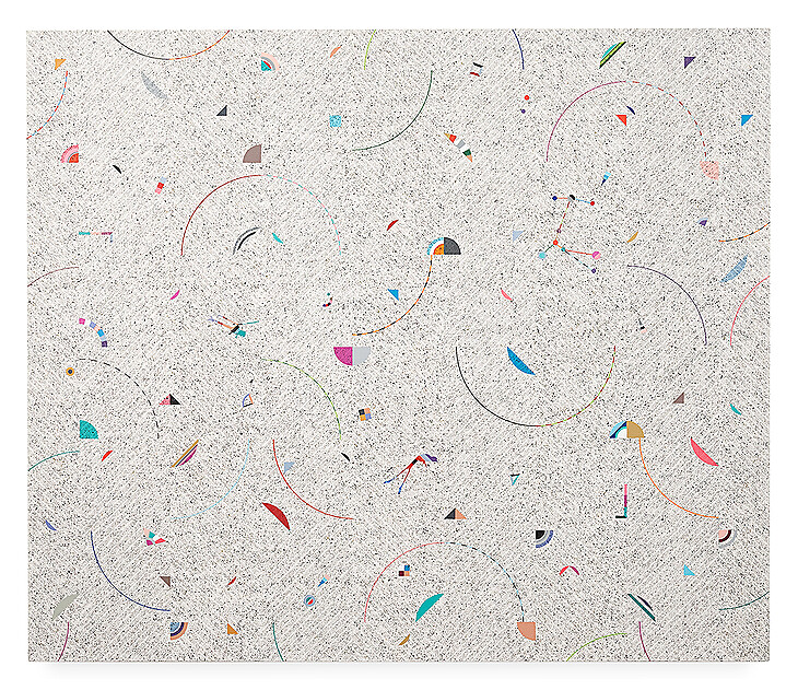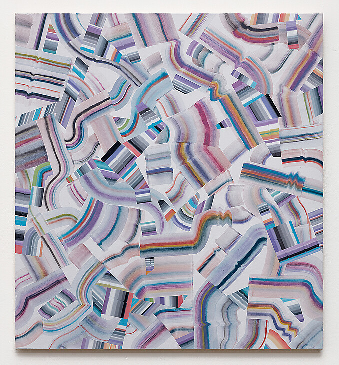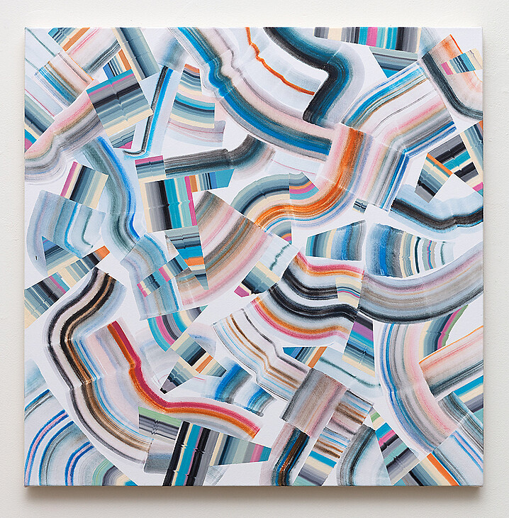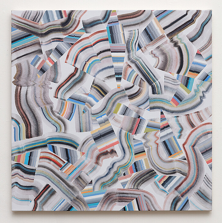 There are intended references from a variety of sources as well as some that tend to develop on their own. One reference comes from the world of textiles. When I was in high school in Philadelphia, where I was raised, one of my first jobs was in a textile factory. I was in charge of replacing empty bobbins into 12 industrial mechanical looms that were constantly spitting out used bobbins. I would run from one loom to another loading bobbins of different colors and thread types. I would also see the relationship between thread on a bobbin and thread that is woven into the produced fabric. My paintings have in part been influenced by this type of energy and also how color is “woven” into my paintings." Vincent Falsetta, 2018